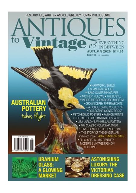 Australia’s No. 1 magazine for anyone with an interest in antiques, collectables and collecting in general. Each magazine is 120 pages crammed with features, news and collecting tips, with informative and interesting editorials, glossy colour illustrations and literally hundreds of items for sale from advertisers across Australia. Discover the world’s best antiques and collectables magazine!Antiques to Vintage is published quarterly with the seasons, and subscriber copies are sent around 7 days before the magazine appears in the newsagents. Please allow up to 2-5 weeks for your first delivery.##