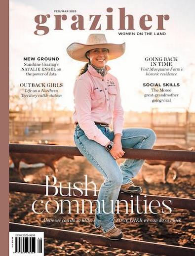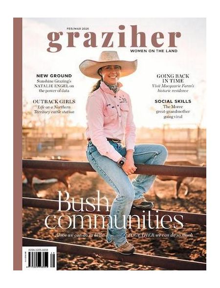 This is a very important issue of Graziher as it marks our 10th birthday. We meet cover girl, Alicia McClymont, who is also celebrating 10 years of her business, Antola Trading. Our Life on the Land podcast co-host Sammie O’Brien held a shoot at her property in the Scenic Rim, Queensland. Ten women including Senator Susan McDonald, netballer Laura Geitz and graziers Penny Button and Julie McDonald spent the afternoon together as we asked them what Graziher means to them. "Women of rural Australia are under-represented in the media, and Graziher has been at the forefront of filling this gap," answered Julie. And don’t miss our fantastic subscription gift — a Graziher x Rabobank 2026 Women of the Land Diary.? Please allow up to 6-9 weeks for your first delivery.##