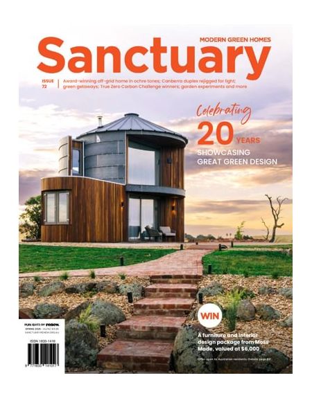 Inside: This issue, we’re celebrating 20 years of Sanctuary! Since our very first issue back in 2005, we’re proud to have showcased the best in Australian sustainable design and how it’s evolving, and in this issue we chat about all things Sanctuary with a collection of people who’ve been involved with the magazine since the early days. Of course, as usual we bring you our pick of the latest crop of ambitious projects from around the country, including a gorgeous off-grid home outside Canberra, three extensions that all delivered hugely improved liveability, and a comprehensive Passive House retrofit. We look at the benefits of truly sustainable short-term accommodation, and profile four top green getaways; the winners of last year’s True Zero Carbon Challenge tell us about their champion design; and Jacqui Hagen investigates the advantages of blending natives with exotic plants in your garden for climate resilience - plus much more. Happy anniversary to us! Please allow up to 10-13 weeks for your first delivery.##